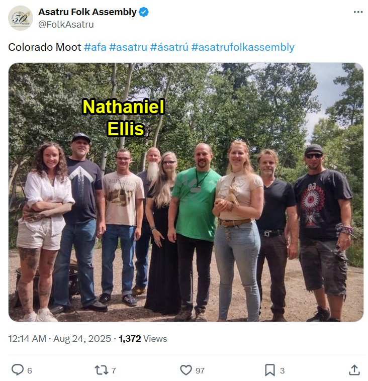 Nathan appeared in a group photo with the white supremacist neo-Pagan group Asatru Folk Assembly on August 24, 2025.
