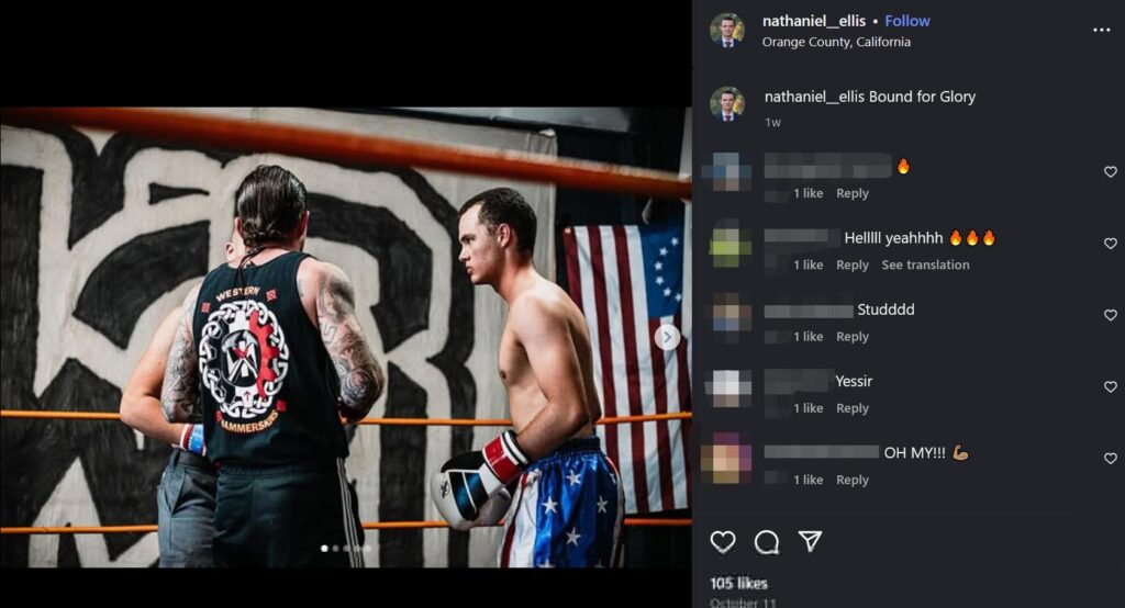 Nathan is seen in a boxing ring in front of a large Will2Rise logo, the organization that Rise Above Movement founder Robert Rundo created after he and other RAM members faced federal rioting charges in connection with the “Unite the Right” rally in Charlottesville and several white supremacist rallies in Southern California. The referee is longtime Western Hammerskins member Jason Baker and close ally of Robert Rundo. This group is a notorious international neo-Nazi gang responsible for a number of white supremacist attacks, including the Wisconsin Sikh temple shooting that left six dead and four wounded.