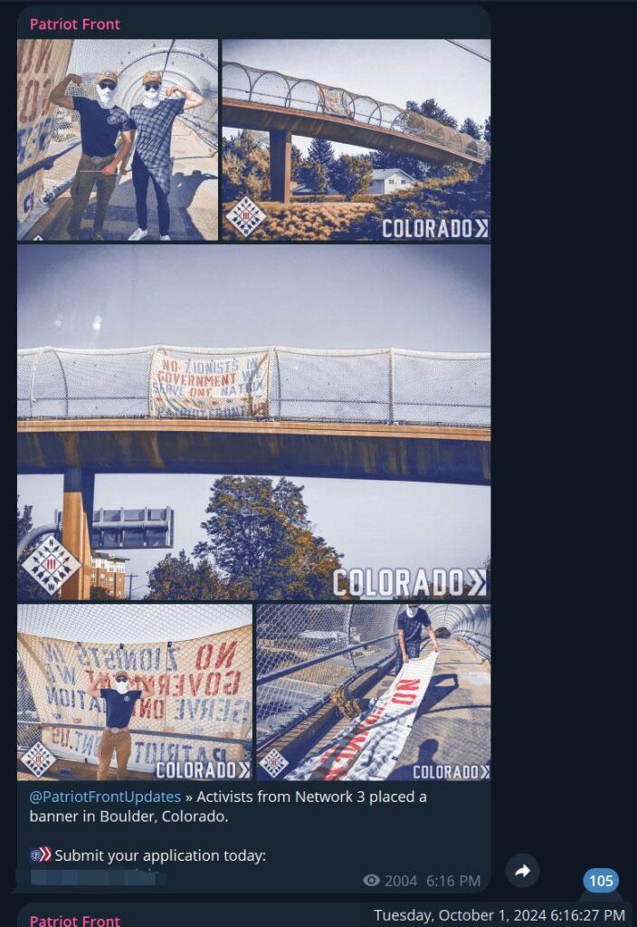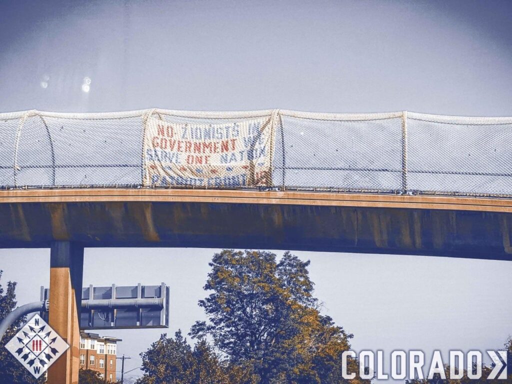 The banner Nathan Ellis hung. Unlike most advocates for Palestinian liberation, Patriot Front and similar neo-Nazi organizations often use anti-Zionism to mask their own vitriolic antisemitism.