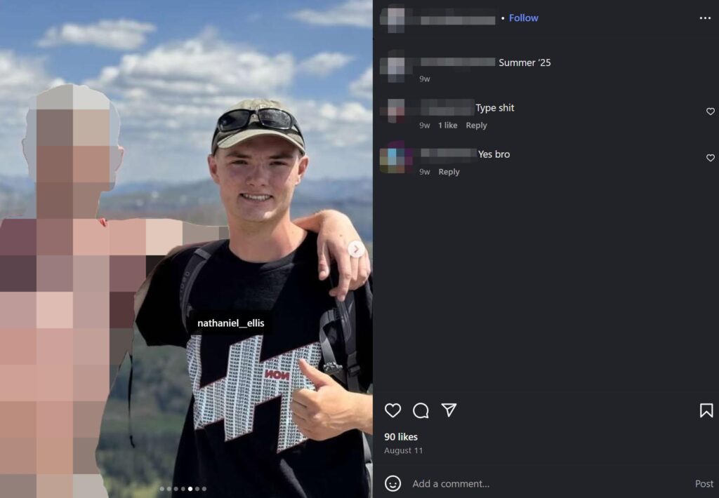 Nathan Ellis wearing his NON shirt in an Instagram post dated August 11, 2025 (left) and at a Patriot Front demo in Utah dated September 13, 2025 (right).