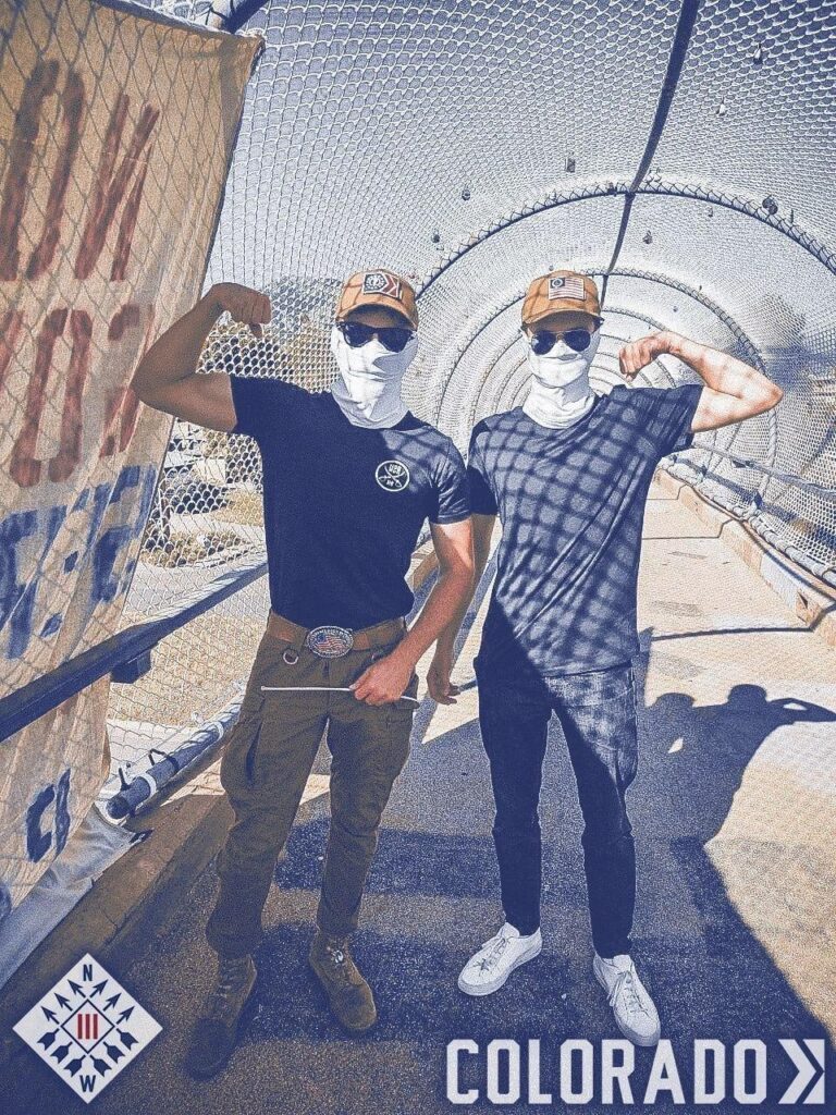 Nathan (right) and an unidentified Patriot Front member hung a Patriot Front banner over Foothills Parkway in Boulder in September, 2024.