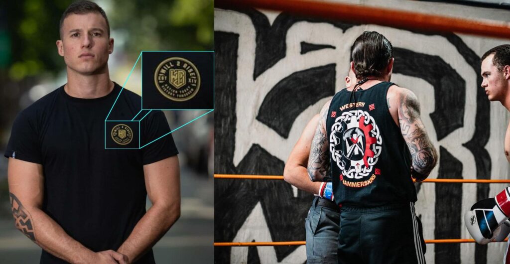Robert Rundo (left) wearing a Will2Rise shirt. Nathan Ellis (right) boxing in front of a Will2Rise logo.