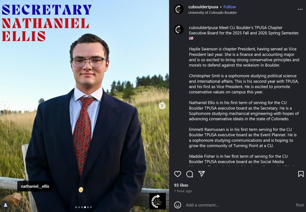 Nathaniel Ellis (19) of Durango, CO is a student at the University of Colorado Boulder, a member of the white supremacist organizations Patriot Front & Active Club, and the Secretary of CU Boulder’s Turning Point USA (TPUSA) chapter.