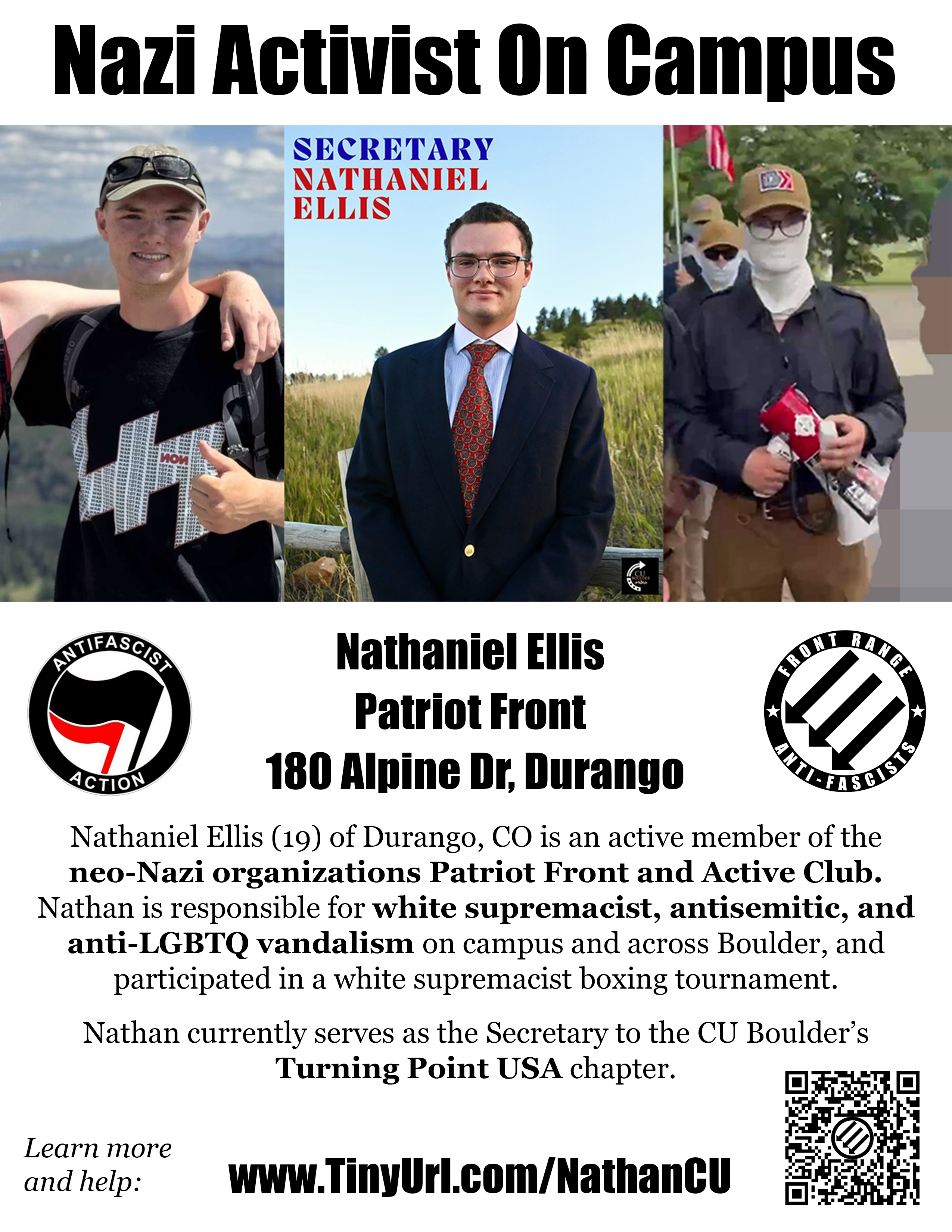 Nathaniel Ellis (19) of Durango, CO is a student at the University of Colorado Boulder, a member of the white supremacist organizations Patriot Front, Active Club, & Asatru Folk Assembly, and the Secretary of CU Boulder’s Turning Point USA (TPUSA) chapter.