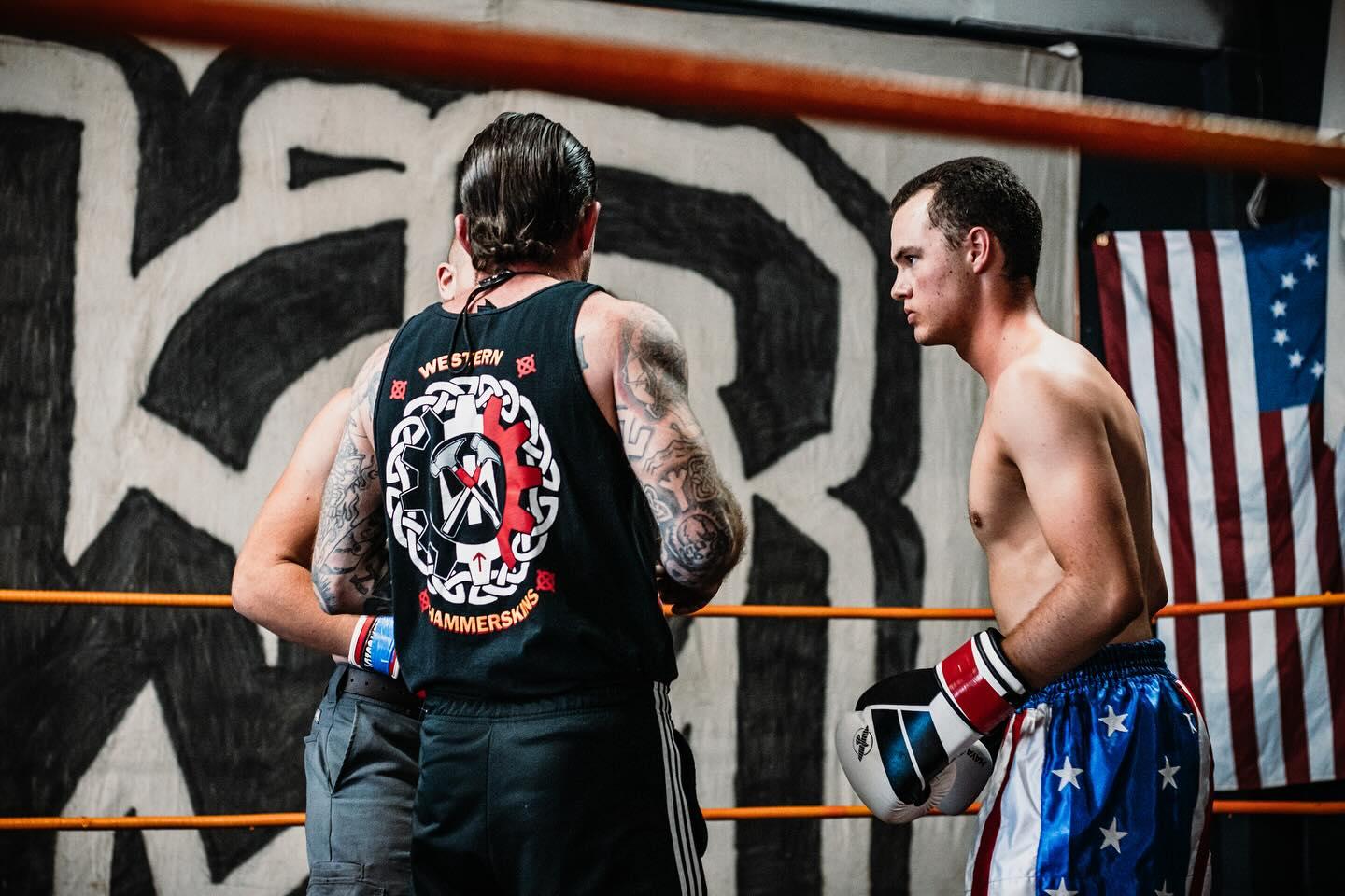 Nathan is seen in a boxing ring in front of a large Will2Rise logo, the organization that Rise Above Movement founder Robert Rundo created after he and other RAM members faced federal rioting charges in connection with the “Unite the Right” rally in Charlottesville and several white supremacist rallies in Southern California. The referee is longtime Western Hammerskins member Jason Baker and close ally of Robert Rundo. This group is a notorious international neo-Nazi gang responsible for a number of white supremacist attacks, including the Wisconsin Sikh temple shooting that left six dead and four wounded.